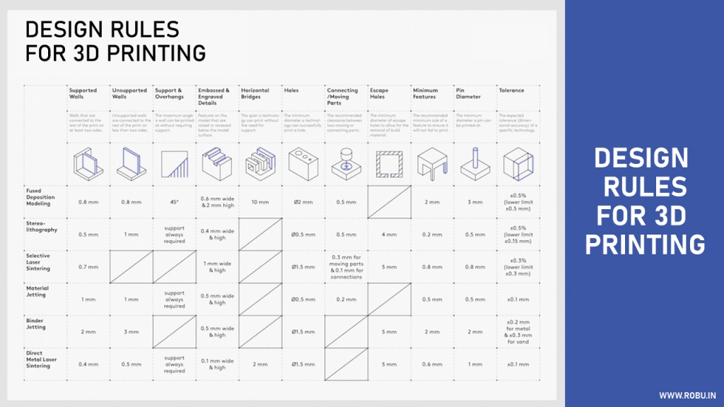 • Follow the 45-degree rule for overhangs and maintain a minimum wall thickness of 0.2mm (SLA), 1mm (FDM), or 0.6mm (SLS) to prevent print failures.